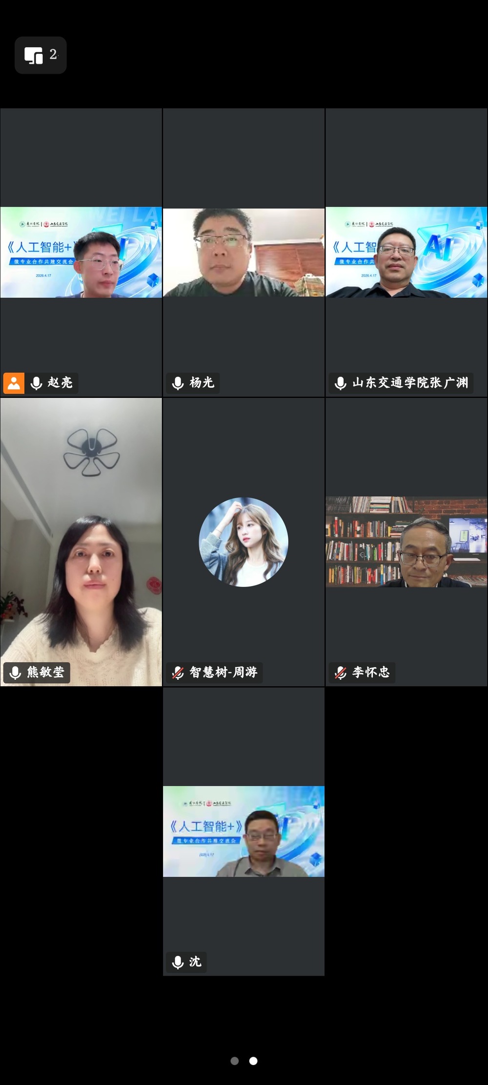为深化人工智能领域人才培养模式改革,探索跨区域、跨校协同育人新机制,4月17日晚,我院与山东交通学院人工智能学院成功举办了一场线上微专业合作共建交流会。会议由智慧树平台方代表赵亮主持,我院和山东交通学院人工智能学院教学负责人及骨干教师团队召开线上会议,就通过线上平台共建人工智能微专业、共享优质教学资源、共育复合型人才等议题进行了深入探讨,并达成合作共识。