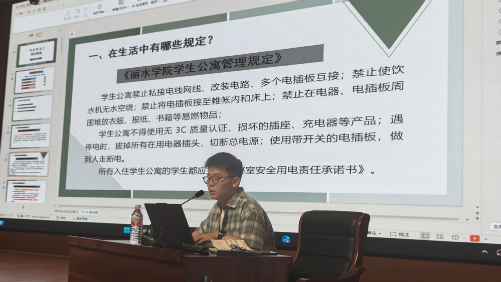 在校纪校规教育部分,黄旭老师重点阐释了大学生行为规范、诚信应考、绿色校园建设以及节水节电节粮等方面内容,倡导新生自觉践行勤俭节约、低碳环保的校园生活方式。此外,黄老师还就文明寝室创建、卫生保持、作息纪律和文明修身等方面提出明确要求,鼓励同学们从日常生活做起,共建和谐、文明、积极的校园环境。