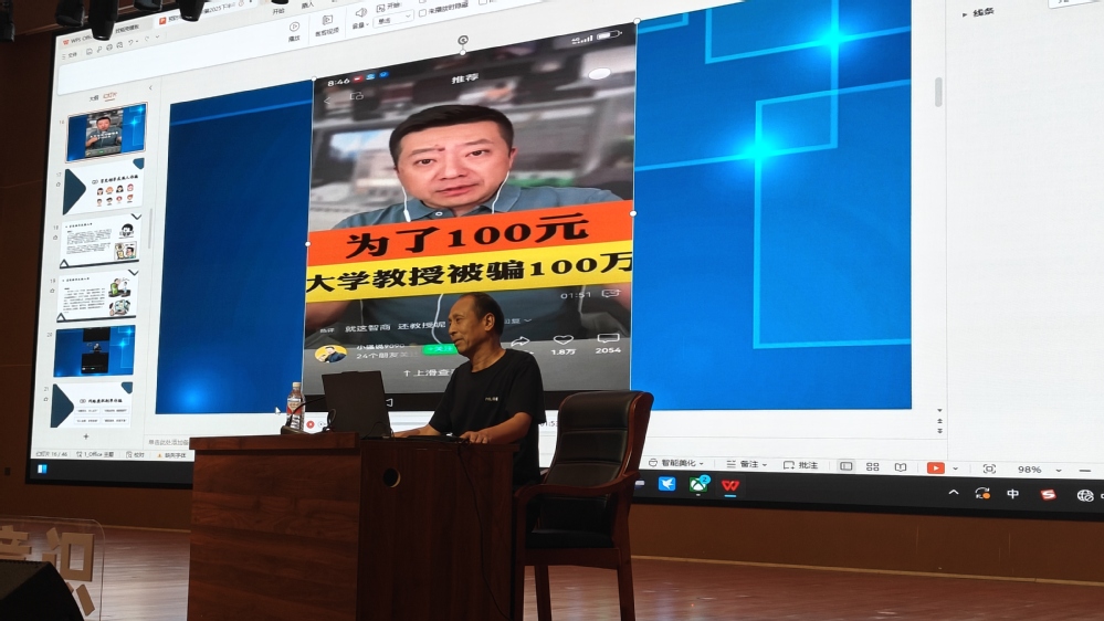 本次讲座涵盖安全法制教育和校纪校规教育两大部分。在安全法制教育环节,学院特邀曹警官围绕防诈骗主题,结合一线公安工作经验,通过真实案例剖析常见诈骗手法,提醒同学们提高警惕、增强辨别能力,保护好个人信息与财产安全。随后,辅导员韩承家系统讲解了安全知识、消防安全以及禁毒防艾相关内容,教育学生掌握基本自救技能,远离危险源,树立健康生活观念。