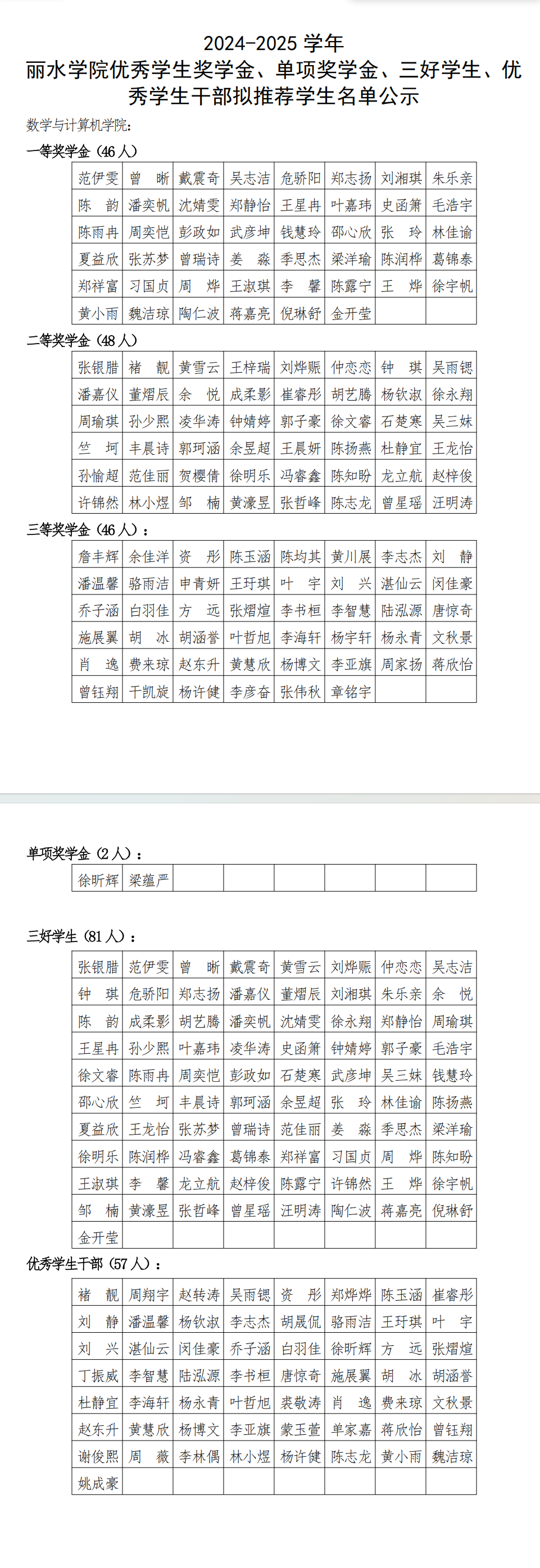 根据《关于统筹做好2024-2025学年评奖评优评选事项的通知》要求,评选按照《丽水学院本专科生奖学金评定办法》和学院、书院其他相关规定进行,经过学生自愿申报、班级推荐,班级公示,学院学生工作领导小组评议,提交学院党政联席会审定等程序,现就丽水学院校级奖学金、三好学生、优秀学生干部评审结果进行公示。