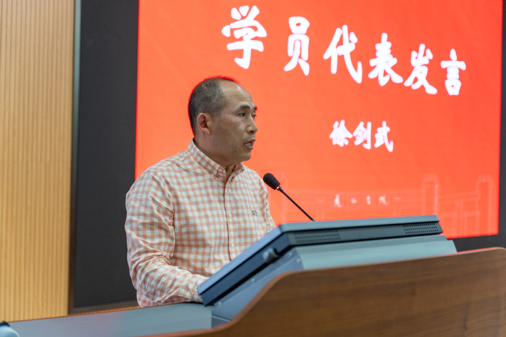 学员代表徐剑武在发言中作表态承诺,将以“空杯心态”认真参训、勤学善思,积极探索创新教学模式,着力提升数字化教学能力,以新技术赋能课堂教学,为推动莲都智慧教育高质量发展贡献自身力量。
